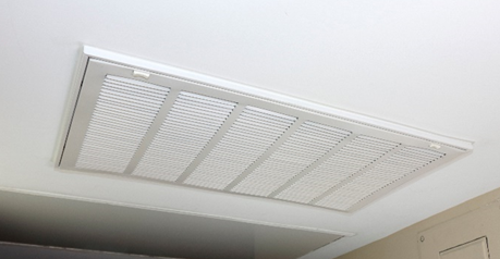 G - Grilles are like registers, but instead of adjustable fins, they have horizontal or vertical bars that create a pattern on the surface. Grilles are typically used for return and exhaust air applications, and their primary function is to protect the ductwork from debris and maintain an aesthetic appearance. They are used in all kinds of commercial buildings. These are usually the vents used to escape in movies, as they are often located lower to the floor, are typically larger in size and would be the easiest option to gain access inside ductwork.